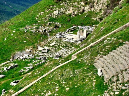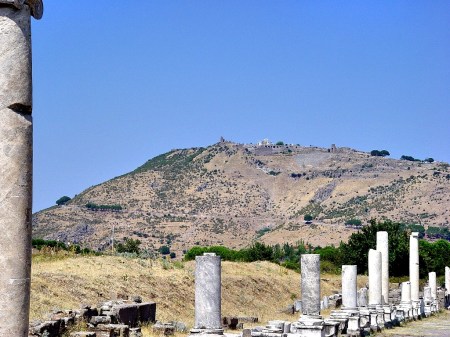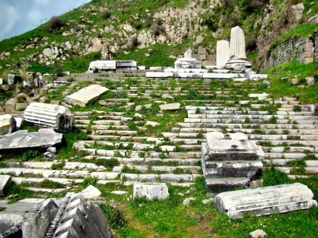The city of Sardis was a center for the worship of the goddess Artemis. The ruins of the temple were excavated by Howard C. Butler in the years 1910-1914. In our photo below you can see the ruins of the temple, and in the distance the city’s acropolis, on the edge of the Tmolus range.