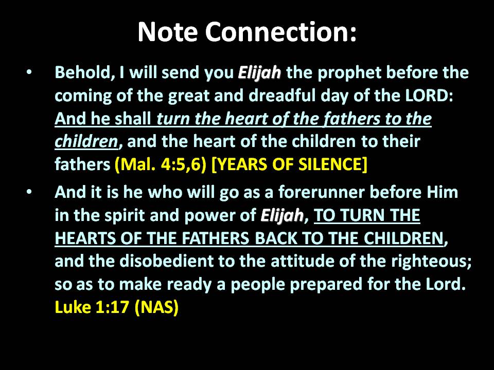 The Old Testament concluded with a prophecy of John’s birth, figuratively referenced here as Elijah the prophet. He would be the forerunner to prepare the people for Jesus’ coming. But although 400+ passed after Malachi’s prophecy, when God renewed revelation, He took up right where He left off, thus continuing the unfolding of His plan to bring Christ into the world. Amazing!