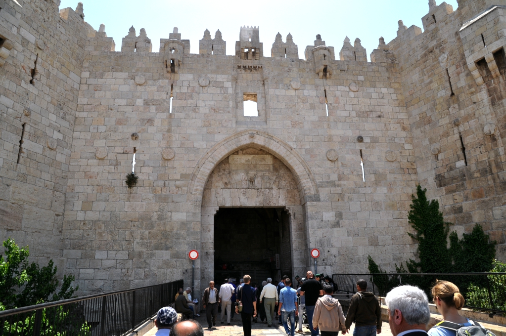 The Damascus Gate is located on the north side of Jerusalem, so named because this would be the direction going out of Jerusalem to Damascus, ca. 150 miles NNW. The Jews call this gate the Shechem Gate, and the Arabs call it Bab el-Amud.