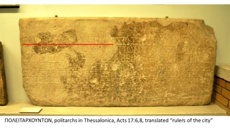 Acts 17:6,8 mention the “rulers of the city” of Thessalonica, who beat and imprisoned Paul and Silas. Luke, the inspired writer of Acts, is a most careful historian. Different cities/districts used specific words to designate their rulers. Here Luke uses the word “politarch” (πολιτάρχης) which was a “very rare title for magistrates” (see Schaff below). Was Luke correct or was he mistaken?