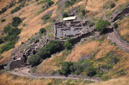 Gamla was a Jewish village in the time of Jesus, though not mentioned in the Bible. It was located on the eastern side of the Sea of Galilee, in the southern Golan Heights. Archaeologists have determined that the date of occupation of this settlement goes back to the Early Bronze Age, pre-dating Abraham by some centuries. Our photo here shows Gamla at center. In distance, far right you can see the Sea of Galilee.