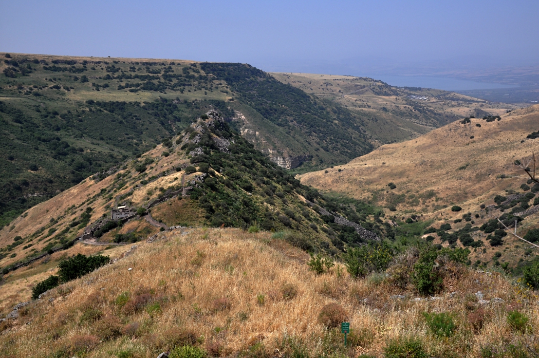 Gamla was a Jewish village in the time of Jesus, though not mentioned in the Bible. It was located on the eastern side of the Sea of Galilee, in the southern Golan Heights. Archaeologists have determined that the date of occupation of this settlement goes back to the Early Bronze Age, pre-dating Abraham by some centuries. Our photo here shows Gamla at center. In distance, far right you can see the Sea of Galilee.