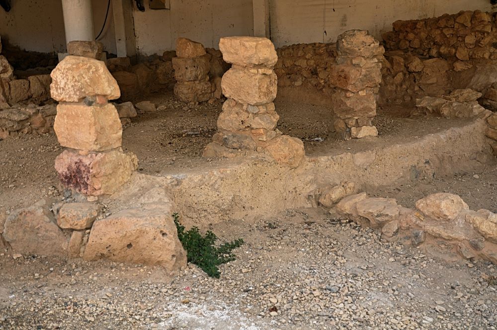 Tel-Hebron consists of approximately twelve acres. It is located about twenty miles south of Jerusalem. Excavations have uncovered a stretch of wall that is dated to the Early Bronze Age, as seen at left in photo here. The well-preserved staircase is made of natural stone slabs, well worn by the city’s ancient inhabitants. Scholars suggest the path likely led to one of Hebron’s city gates. At right is an additional wall constructed at a later date than that on your left.