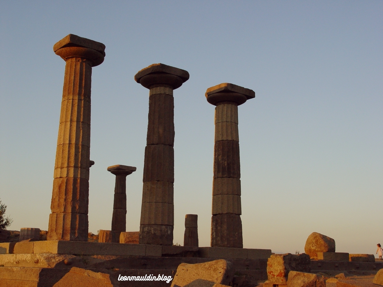 Our photo below shows some of the remaining columns of the temple there at Assos, captured as the sun was setting. Note the little girl at lower right for a sense of scale.