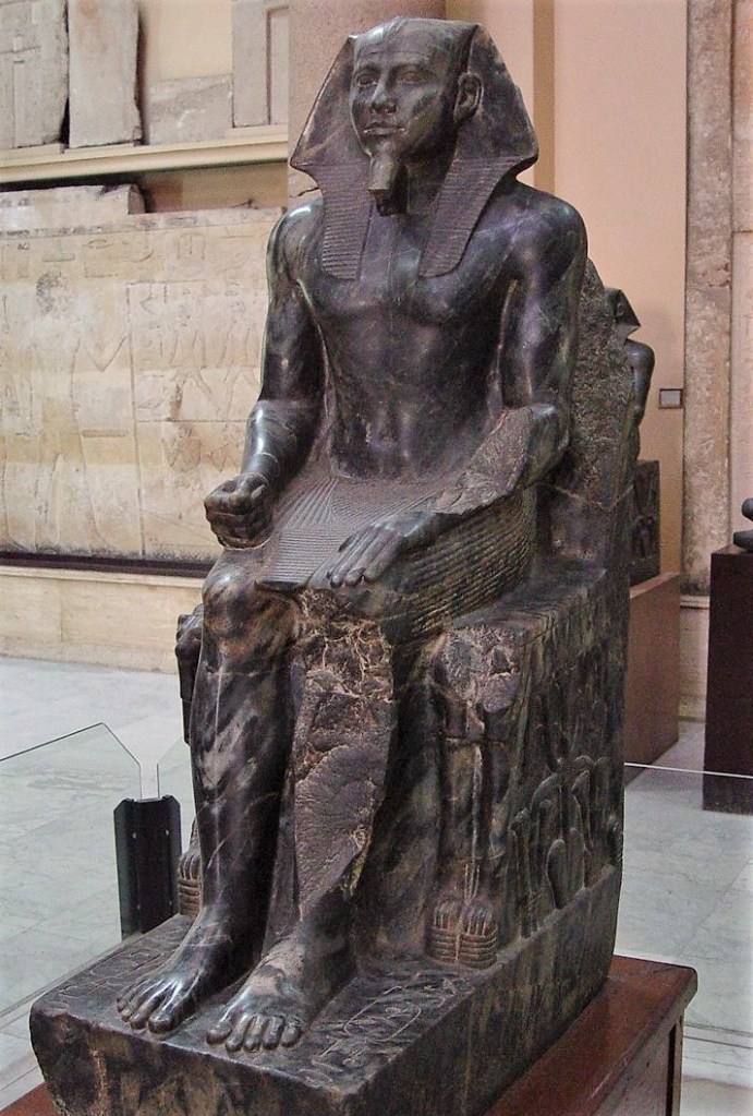This life-sized statue is housed in the Egyptian Museum in Cairo, having been discovered by Auguste Mariette in 1860, in Chephren’s valley temple at Giza. It is made of diorite, a high quality stone. On the stature throne are carved symbols of royalty, the lion paws on the front, and on the sides are displayed the symbol of the sema-tauy, representing the uniting of Upper and Lower Egypt.