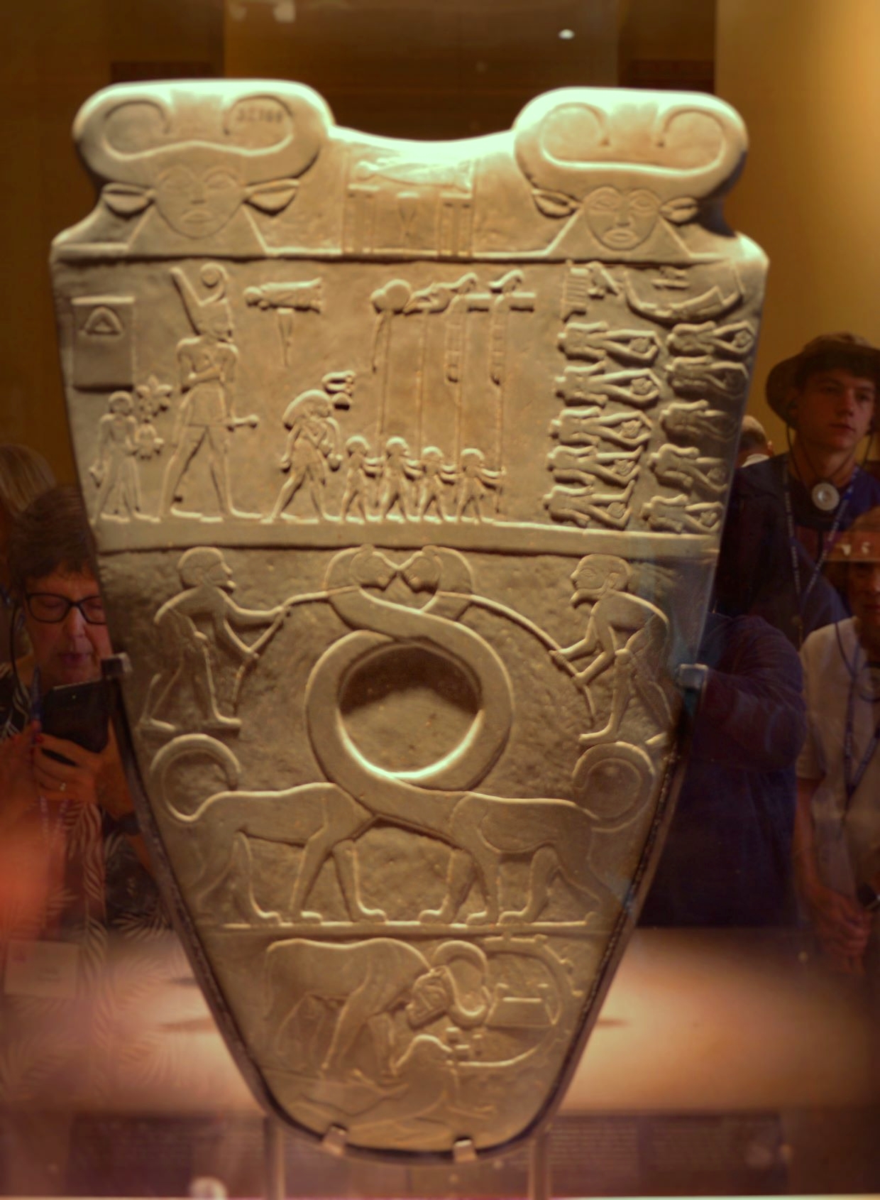One of the very significant displays considered to be “of major artistic and historical importance” (Illustrated Guide to the Egyptian Museum, eds. Bongioanni and Croce, p. 28, discussed in “Protodynastic and Predynastic Periods”) is the Narmer Palette. This votive tablet “is the earliest record from Egypt (Chronicle of the Pharaohs, Clayton, p.18).
