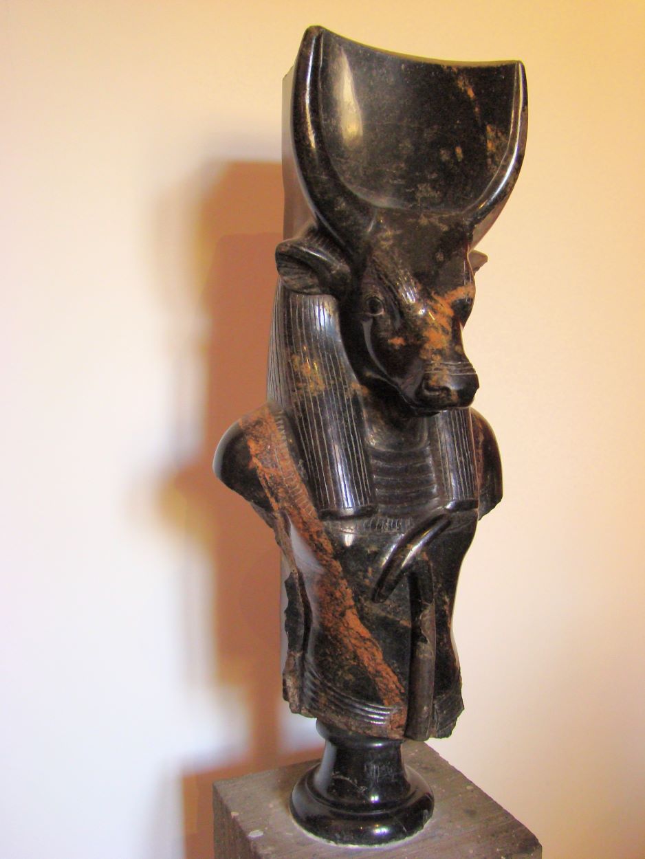 Apis is the bull god of the Egyptian pantheon. According to religious belief, Apis was the son of Ptah, who impregnated the mother cow via lightning bolts or moonbeams. In some myths, Apis was the son of Hathor, a heifer goddess often depicted with the sun disk between her horns; the same symbol often appears in visual representations of Apis (see Malaise, “Histoire et signification”).