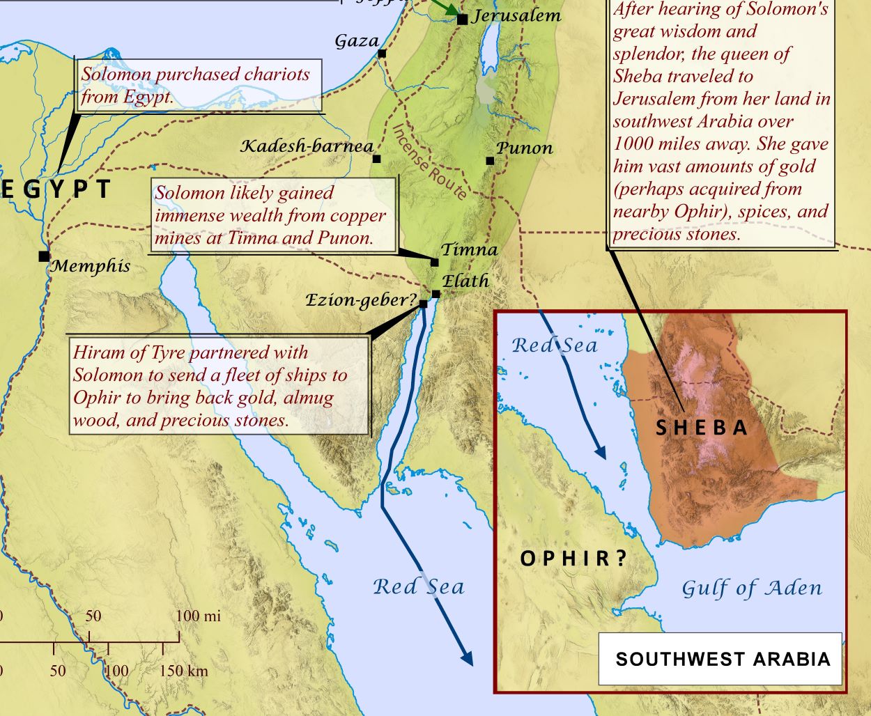 The location of Elath was at the southern tip of the Arabah, and the north eastern tip of the Red Sea, at the Gulf of Aqaba. This allowed Solomon’s fleet of ships access to the Red Sea and of course, south from there into the Indian Ocean. It would seem that through this means of commerce the Queen of Sheba (see map inset) learned of Solomon, and made the journey to see for herself the incredible reports she had heard (related in the next chapter, 2 Chron. 9:1-12).