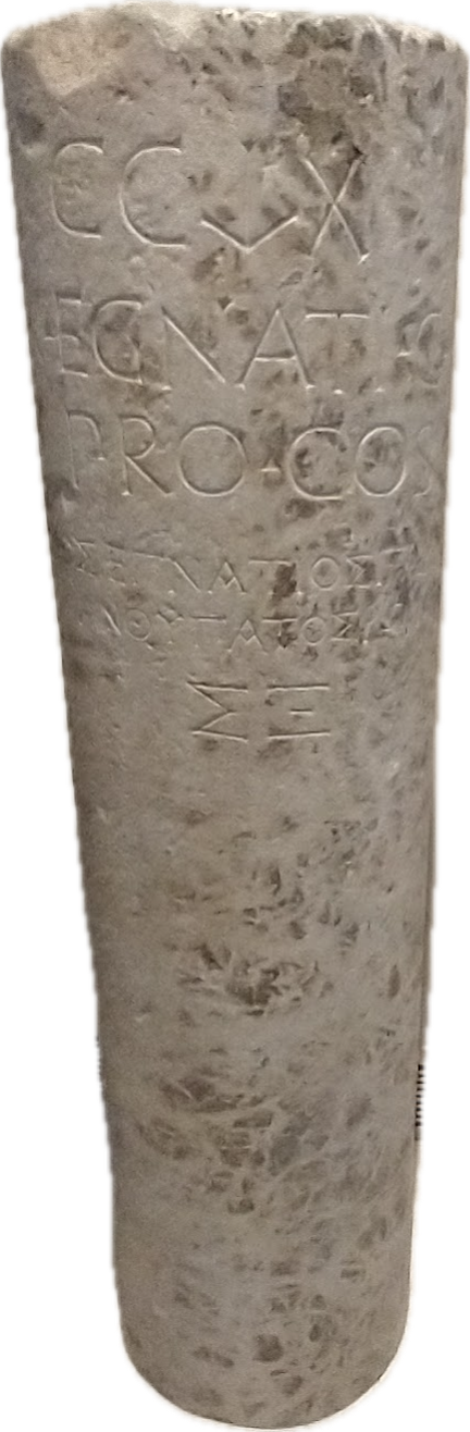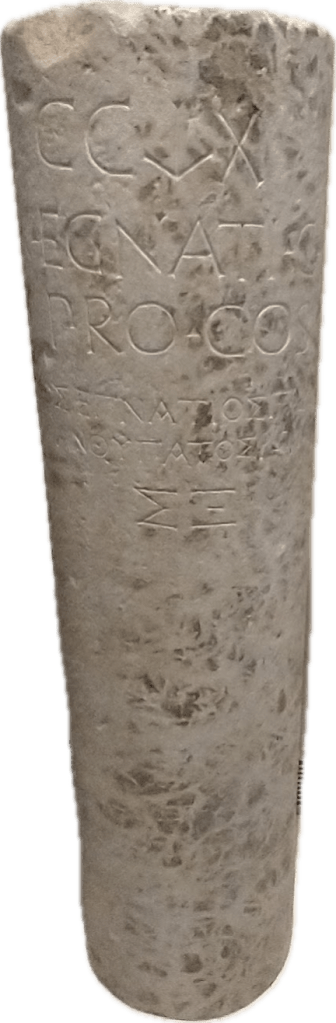 One very important archaeological find on the Via Egnatia is the milestone pictured here above. The inscription is bilingual. It contains the name of the governor of the province of Macedonia, Gnaius Egnatus (served in late 140s BC), who was responsible for the construction of this Roman road. Hence the name, Via Egnatia. The milestone was found near the point where the Via Egnatia crossed the Gallikos River, west of Thessaloniki. This inscription also accurately reports the length of the road to be 260 miles.