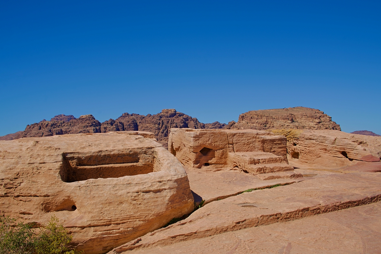 The High Place at Petra is one of the best preserved of all such sacred installations in the ancient Near East. Its location is imposing, approximately 3,400 feet above sea level and 625 feet above the temenos. The altar platform was approached by three steps. It is situated about 3 feet above the level of an adjoining courtyard area and is equipped with drains and basins for sacrifices and ablutions.