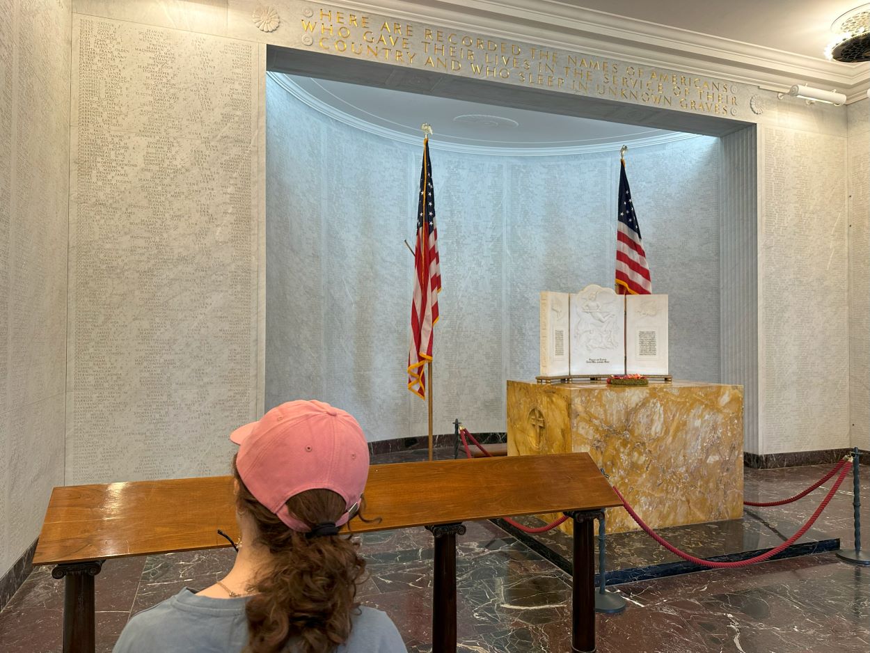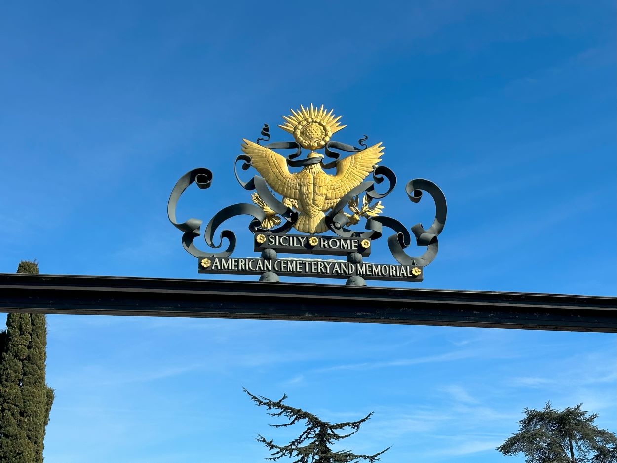 A wide central mall leads to the memorial, rich in works of art and architecture, expressing America’s remembrance of the dead. It consists of a chapel to the south, a peristyle, and a map room to the north. On the white marble walls of the chapel are engraved the names of 3,095 of the missing. Rosettes mark the names of those since recovered and identified. Source: https://www.abmc.gov/Sicily-Rome